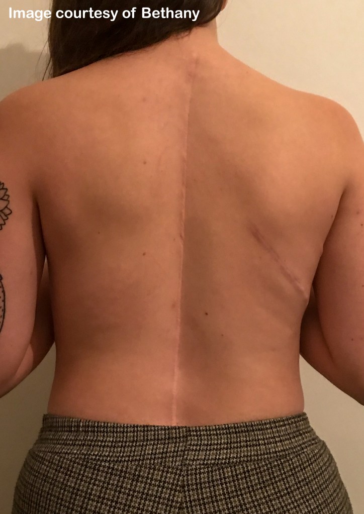 I have many scars on my body, but the pictures are from spinal surgery to correct scoliosis (curvature of the spine). I had a 68 degree curve. I have one long scar running down the length of my spine, a scar wrapping around my ribcage and a smaller scar just above that. When I was 13, I was diagnosed with Scoliosis and had surgery at 14. It took two long operations, more than two weeks in hospital and the better part of a year for my scars to heal completely.